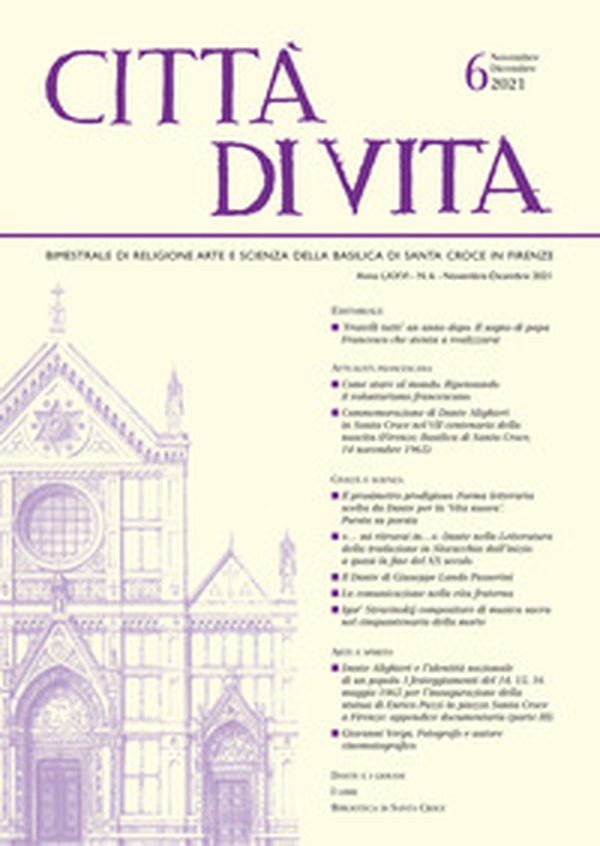 In questo numero: Antonio Di Marcantonio, 'Fratelli tutti' un anno dopo. Il sogno di papa Francesco che stenta a realizzarsi; Padre Orlando Todisco, Come stare al mondo. Ripensando il volontarismo francescano; Mons. Giovanni Fallani, Commemorazione di Dante Alighieri in Santa Croce nel VII centenario della nascita (Firenze, Basilica di Santa Croce, 14 novembre 1965); Fornaretto Vieri, Il prosimetro prodigioso. Forma letteraria scelta da Dante per la 'Vita nuova'. Poesia su poesia; Pierino e Talita Montini, «... mi ritrovai in...». Dante nella Letteratura della traduzione in Slovacchia dall'inizio a quasi la fine del XX secolo; Simone Allegria, Il Dante di Giuseppe Lando Passerini; Massimo Lucchesi, La comunicazione nella vita fraterna; Jan Wladyslaw Wos, Igor' Stravinskij compositore di musica sacra nel cinquantenario della morte; Francesca Fedeli, Dante Alighieri e l'identità nazionale di un popolo. I festeggiamenti del 14, 15, 16 maggio 1865 per l'inaugurazione della statua di Enrico Pazzi in piazza Santa Croce a Firenze: appendice documentaria (parte III); Egidia La Neve Torsella, Giovanni Verga. Fotografo e autore cinematografico; Classe 3B del Liceo Scientifico ISIS Gobetti-Volta, Una classe alla scoperta della Commedia; Novella Maggiora, Al poeta dell'Umanesimo e padre della lingua l'edizione celebrativa del 1865.