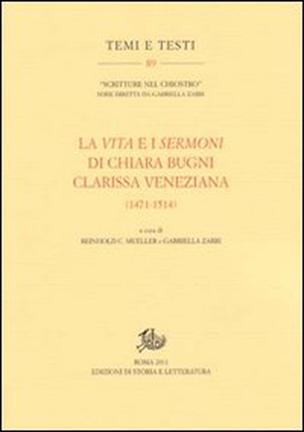 La vita e rivelazioni della beata Chiara Bugni, composta dal francescano Francesco Zorzi (prima metà del secolo XVI), sotto l'apparente semplicità di una biografia spirituale, nasconde significati simbolici trasmessi in forma di visioni e rivelazioni, compendiate da un noto teologo cabalista che visse ed operò prevalentemente a Venezia. Il nucleo fondamentale è rappresentato dall'edizione critica, che documenta tutte le testimonianze relativa alla beata. Oltre a questo, un testimone più autorevole della Vita dello Zorzi, contenente anche altri testi in volgare stesi da consorelle e approntati per il monastero a metà '500 dal traduttore della Vita, Andrea Pilolini. I testi di corredo costituiscono un ulteriore approfondimento e consentono di ricostruire la provenienza dei testimoni in volgare e il loro uso da parte degli agiografi attraverso i secoli; di identificare i luoghi della beata e di investigare le radici religiose della società veneziana negli anni in cui visse la beata stessa. Completa il volume la descrizione degli scavi, approntati sotto il Presidio Militare "Aristide Cornoldi" di Venezia, costruito sull'area già del monastero che fu della beata Chiara Bugni.